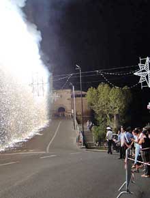 Il momento è sempre suggestivo: centinaia di persone attendono sotto le mura merlate l'arrivo della statua del Santo Patrono ed al suo passaggio una grande pioggia di fuoco, come un doveroso saluto del paese al suo protettore, inonda le mura illuminandole a giorno e lasciando tutti con il naso all'insù; davvero uno spettacolo unico al mondo.