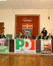 Nella sala conferenze della Provincia a incoraggiare Sposetti candidato sindaco ci sono tutti. Marrazzo, Mazzoli (presentatore per caso), Brachetti (nel Pd per caso), Donatella Ferranti (capolista non a caso), Parroncini, e Fioroni arrivato in ritardo (guarda caso).