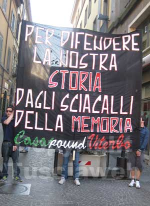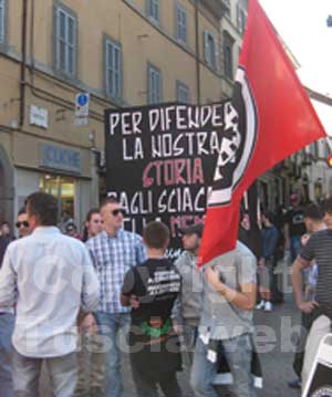 I ragazzi di Casapound, una cinquantina, hanno sistemato il loro gazebo a piazza Verdi, all'inizio del corso. Con un grosso striscione che non passava inosservato. L'iniziativa era per non dimenticare il massacro delle foibe. Alla sala Gatti, invece, incontro per discutere di imperialismo e guerre.